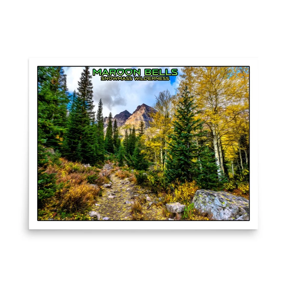 The photo that inspired this art was taken at Maroon Bells Snowmass Wilderness in Colorado in the fall of 2019. It was my first trip to the Maroon Bells and the leaves were in full bloom changing colors. As we approached the second lake the leaves lined the trail and made a perfect fall photo.